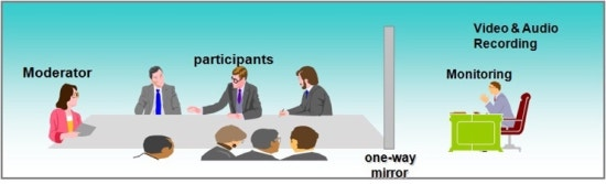 “FGI는 그림에서처럼 특별한 방에서 7~8명의 참석자를 대상으로 비구조화된 설문 가이드라인을 가지고 전문 모더레이터(Moderator)라고 하는 숙련된 사회자의 진행에 따라 약 2시간 동안, 참석자들 간의 상호작용과 자유로운 대화 분위기에서 자연스럽고 무의식적인 표현 방법을 통해 폭 넓고 심층적인 정보를 수집한 방법입니다. 방에는 한쪽으로만 보이는 거울이 설치 되어 있어서, 여러분들 같은 클라이언트들이 오시면 참석자들 모르게 다른 방에서 직접 회의하는 모습을 참관할 수도 있습니다.”