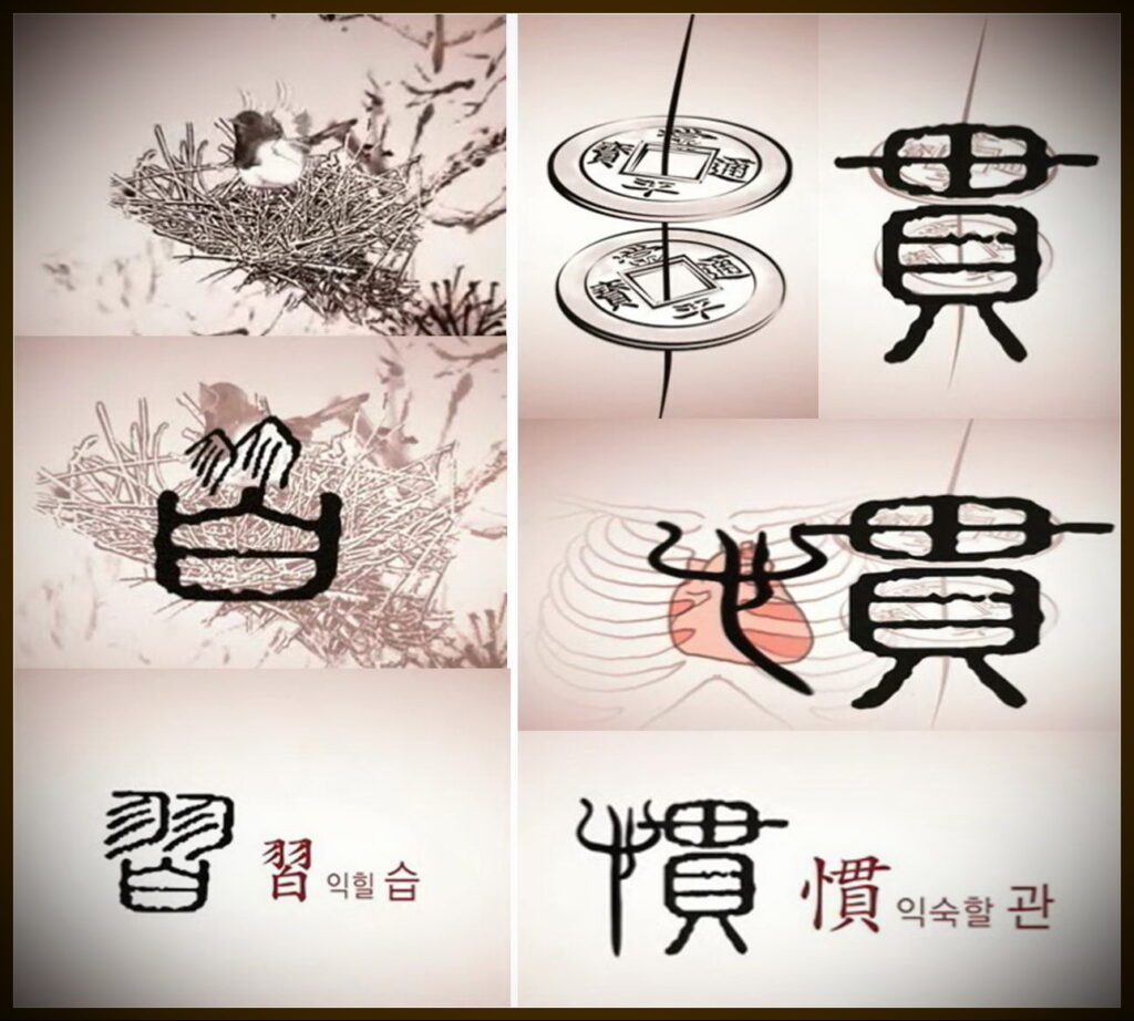 습관(習慣)의 한자어를 보면 습(習)자는 둥지에서 어린 새가 하늘로 날기 위해 날개를 계속 퍼덕이는 모습을 형상화한 것이고, 관(慣)자는 마음 심(心)에 꿸 관(貫)자가 더해진 것이다. 즉 어린 새의 날개 짓이 마음에 꿰였다는 뜻이다.