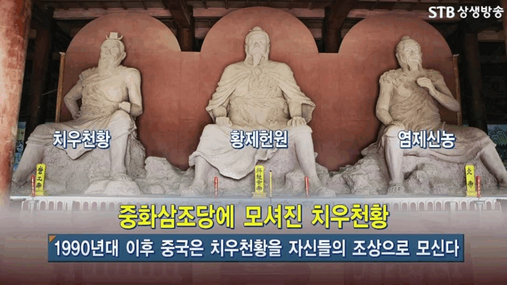 In Takrok, there is a shrine known as the Three Ancestors Hall, which honors three great ancestors of Chinese civilization. Enshrined here are Yandi Shennong, an ancestor of the Korean people, Chiwoo Cheonhwang, and the Yellow Emperor, regarded as the progenitor of Chinese history. These are colossal statues, each measuring an imposing 5.5 meters in height, with the Yellow Emperor seated in the center and the other two flanking him. The Chinese have long revered Taihao Fuxi and Yandi Shennong, ancestors of the Korean people, as their own. And now, with the construction of the Three Ancestors Hall, they have even enshrined Chiwoo Cheonhwang as one of their ancestors. However, murals inside the hall depict Chiwoo Cheonhwang in battle against the Yellow Emperor.