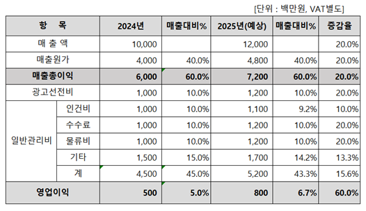 그래서 매출총이익율 다음으로 적정 수준의 판관비율을 머리속에 항상 파악하고 있어야 한다. “매출총이익-판관비=영업이익”이므로, 이는 곧 영업이익율과 직결되기 때문이다.