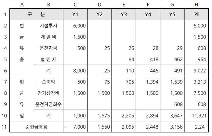 그런데 주의할 점은 미래의 수익에 대한 손익계산서 상의 수치가 아니라, 앞서 살펴본 현금흐름으로 사업성을 평가해야 한다. 고정자산의 취득이나 R&D 투자 등, 자금의 투하는 현재 현금의 지출에 속하지만 예상되는 수익은 미래에 들어오는 것으로써, 자금투자시기와 수익획득시기의 차이가 발생하기 때문이다.