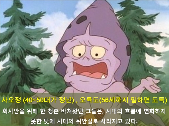 오직 회사만을 위해 한 청춘 바쳐왔던 그들은, 자신의 계발을 소홀히 하고 시대의 흐름에 변화하지 못한 죄로 천형과도 같은 너무도 큰 벌을 한번에 다 받으며 시대의 뒤안길로 사라졌다. 그리고 이런 일들은 한 시대로 사라진 일이 아니라, 지금도 더욱 심하게 진행되고 있는 대한민국의 아픈 현실이다. (계속)