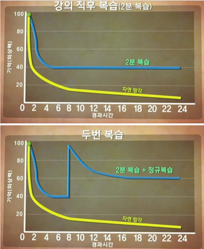 그에 의하면 강의를 받은 후 하루가 지나면 대부분의 사람들은 기억이 거의 사라져 강의 내용의 약 20%정도만 기억에 남는다고 한다. 그러나 만약 강의 직후 2분만 복습을 하여도 강의 내용의 40%를 기억할 수 있으며, 몇 시간이 지난 후 두 번째 복습하였을 경우에는 강의 내용의 60%를 기억할 수 있다고 한다.
