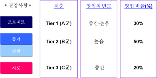 이제부터는 D급에 쏟아 부었던 노력을 A, B급에 집중하며, C급은 B급으로, B급은 A급으로 육성하는 한편, D급을 대체할 신규를 개발하기 위해, 각 등급별로 정확한 대상 고객을 설정(Right Targeting)하여 고객 등급에 맞게 차등화 된 영업활동을 해야 할 것이다.